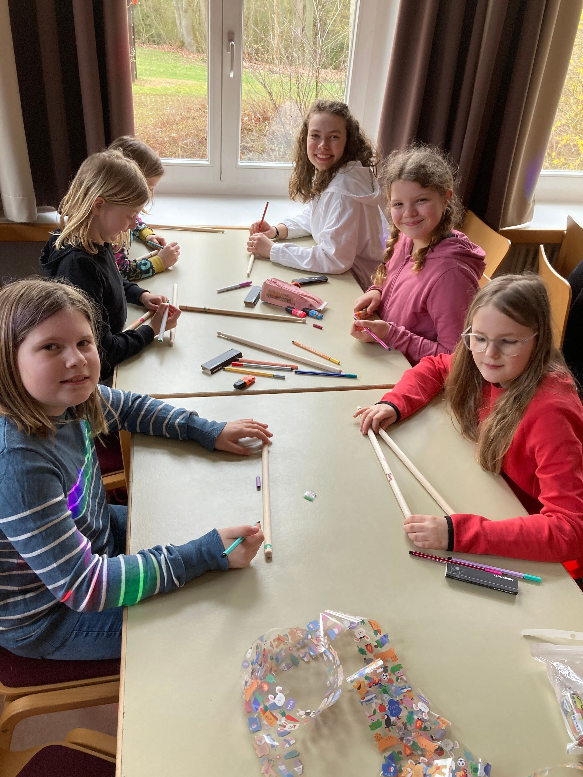 Den ersten Tag haben wir mit Kennenlernspielen und dem Gestalten von eigenen Trommelsticks verbracht, bevor wir nach dem Abendessen noch ein Gruppen-Geländespiel gespielt haben.